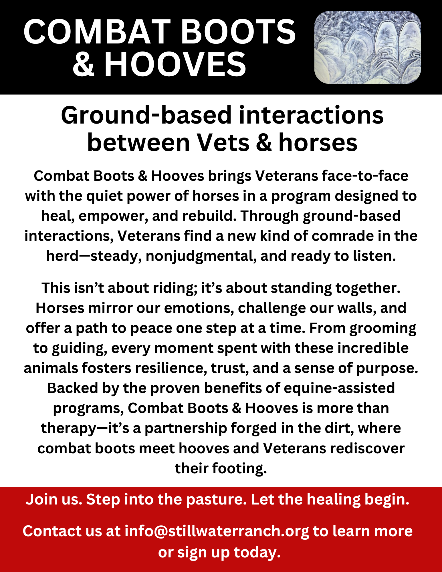 Backed by the proven benefits of equine-assisted programs, Combat Boots & Hooves is more than therapy—it’s a partnership forged in the dirt, where combat boots meet hooves and Veterans rediscover their footing.